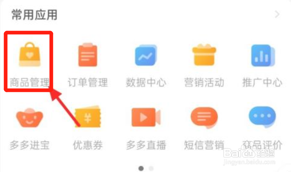1、第一步,在拼多多商家版首页,选择上方的商品管理选项。